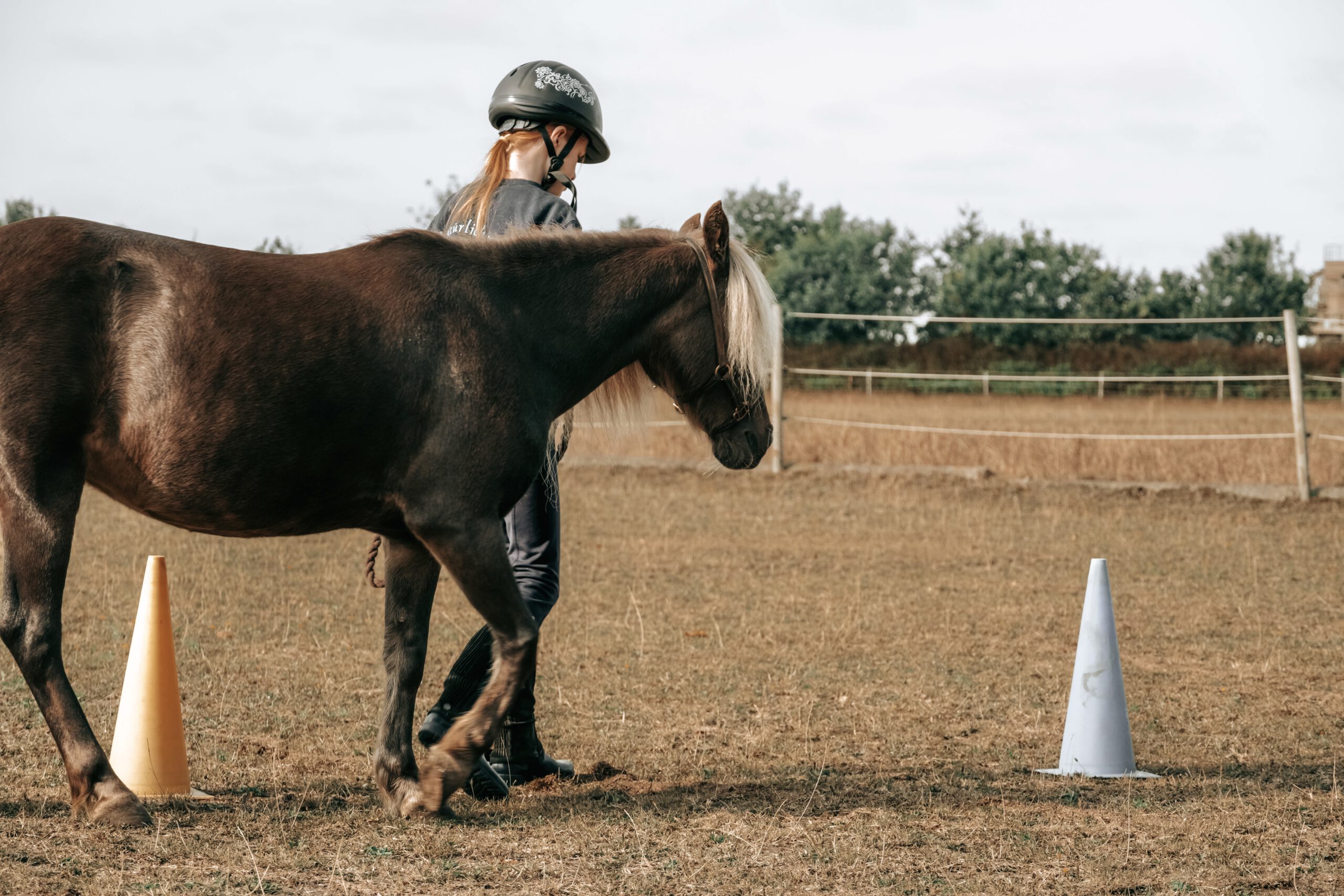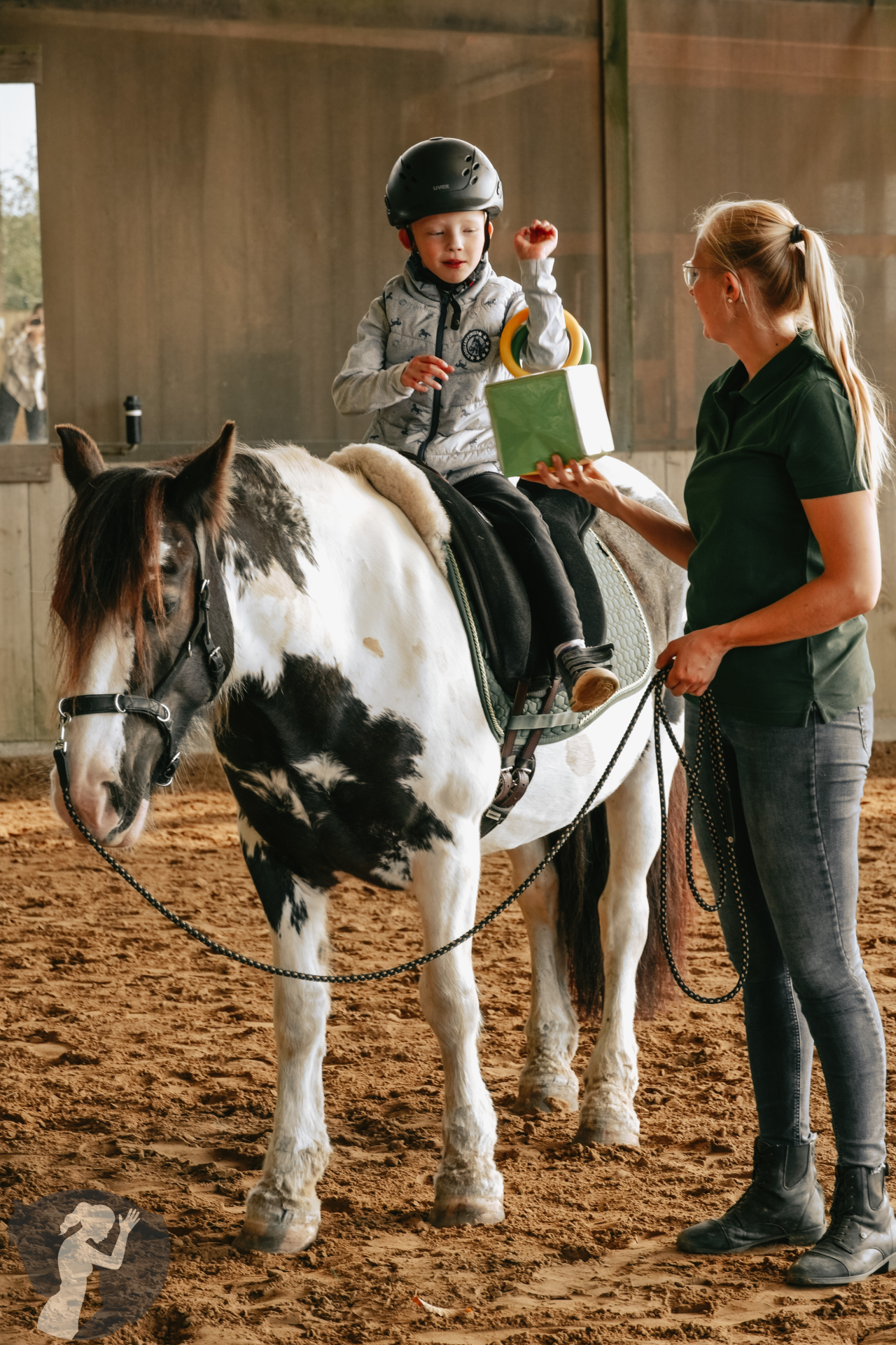 In der Bodenarbeit unterstützen Bewegungsparcours – stets begleitet vom Pferd – die Weiterentwicklung der motorischen Fähigkeiten. Dabei kommen unter anderem Balanceübungen, das Werfen und Fangen von Bällen, das gezielte Transportieren oder Platzieren von Gegenständen sowie das Überwinden kleiner Hindernisse zum Einsatz. Diese Übungen fördern Bewegungsplanung, Koordination und Orientierung im Raum.