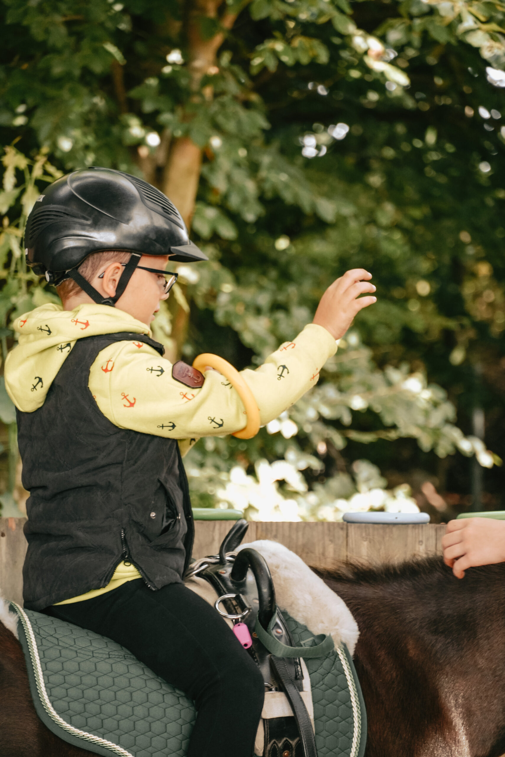 Die rhythmischen, dreidimensionalen Bewegungen des Pferdes wirken direkt auf den Körper und fördern die Aufrichtung sowie die Wahrnehmung der Körpermitte. Gerade bei Menschen mit geringer Rumpfstabilität zeigt sich immer wieder, wie hilfreich das therapeutische Reiten ist. Auch das Reiten im Gelände bietet wichtige motorische Reize: Der unebene, nachgebende Untergrund sowie das Reiten von Hügeln hinauf und hinunter fordern eine ständige Anpassung der Körperhaltung, fördern die Tiefensensibilität und erweitern das Bewegungsspektrum durch neue Erfahrungen.
